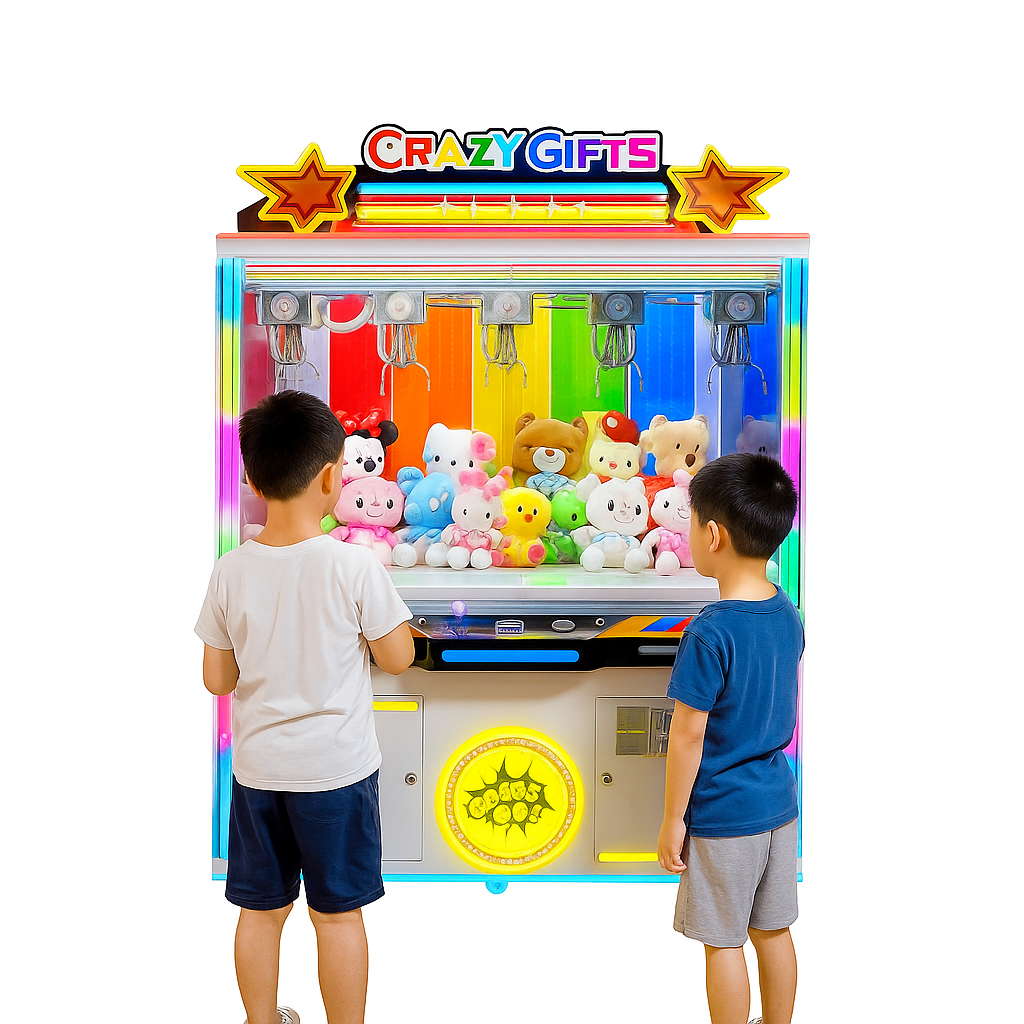 Bring color and fun to any arcade or business with theCrazy Gifts 5-Claw Prize Machine!This extra-large arcade cabinet featuresfive independent claw armscontrolled byone central joystick and button, allowing players to switch between different prize sections. With a bold rainbow LED design, large display area, and includedbill & coin acceptors, it’s a proven attention-grabber built to earn.